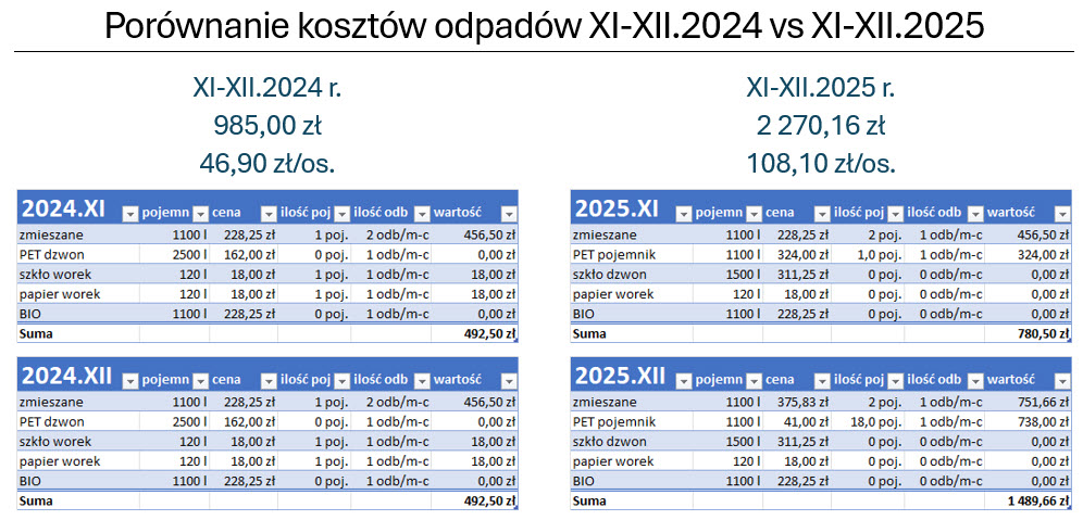 Wysokość opłat za odpady za miesiące listopad oraz grudzień pomiędzy rokiem 2024 a 2025 wzrosła z 985,00 zł to aż 2270,16 zł.